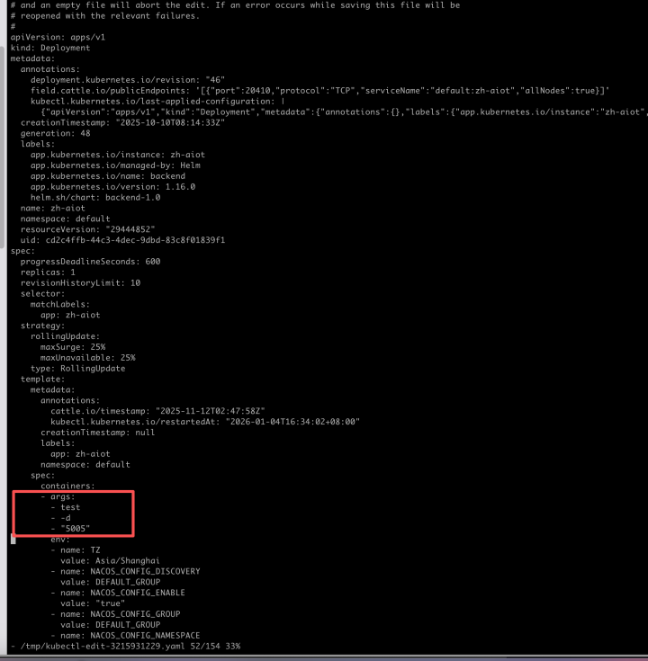 还有一种方式是通过命令行开始 debug,会麻烦一些,首先进入服务器然后执行命令:kubectl edit deployment 项目名,根据 yaml格式,在spec.spec.containers.args 下面跟上对应参数即可,最后通过键盘大写,按两下 Z 键即可保存生效。或者输入冒号:wq 也可以保存,需要注意的是这里的编辑是 vim 编辑方式,按i 进入编辑模式,按 esc 退出编辑模式。