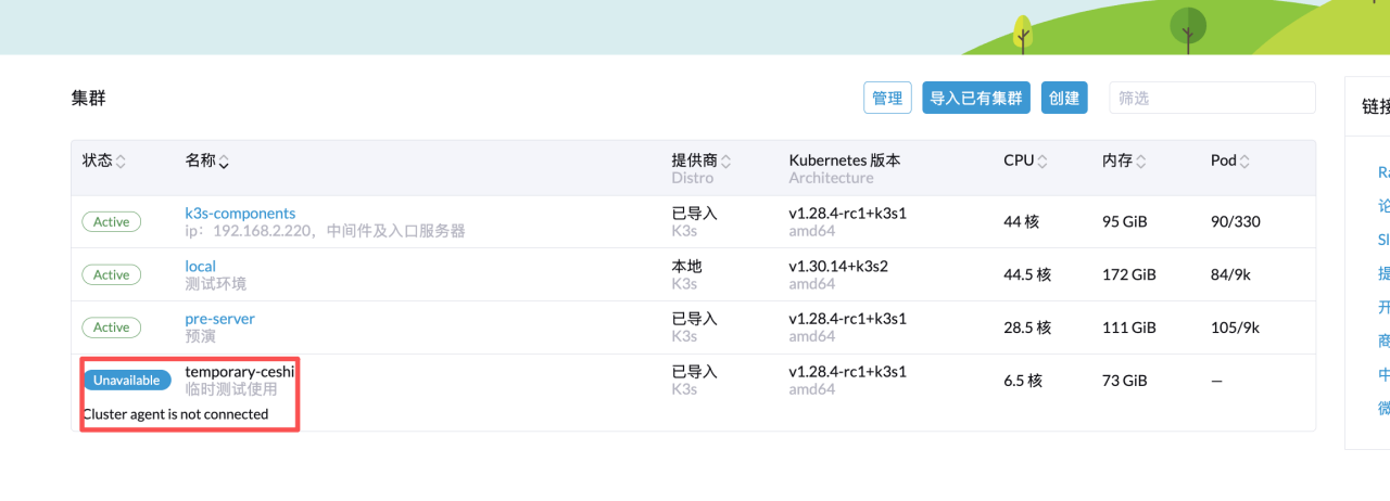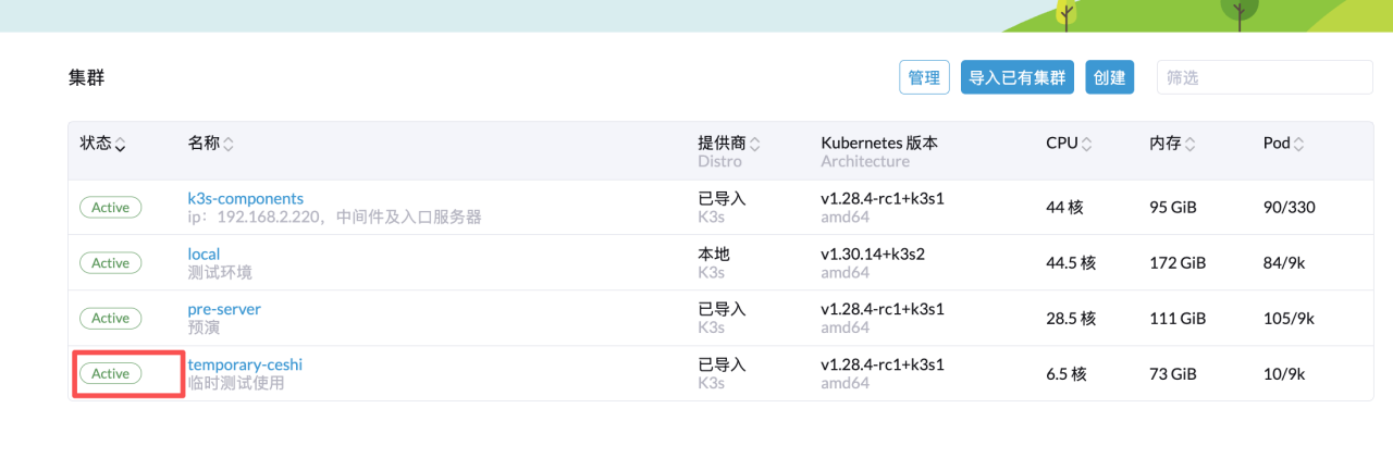 登录 rancher,在首页可以看到所有集群,通过其状态即可知道集群本身是否存在异常,如果现在 Active 则表示集群本身正常运行