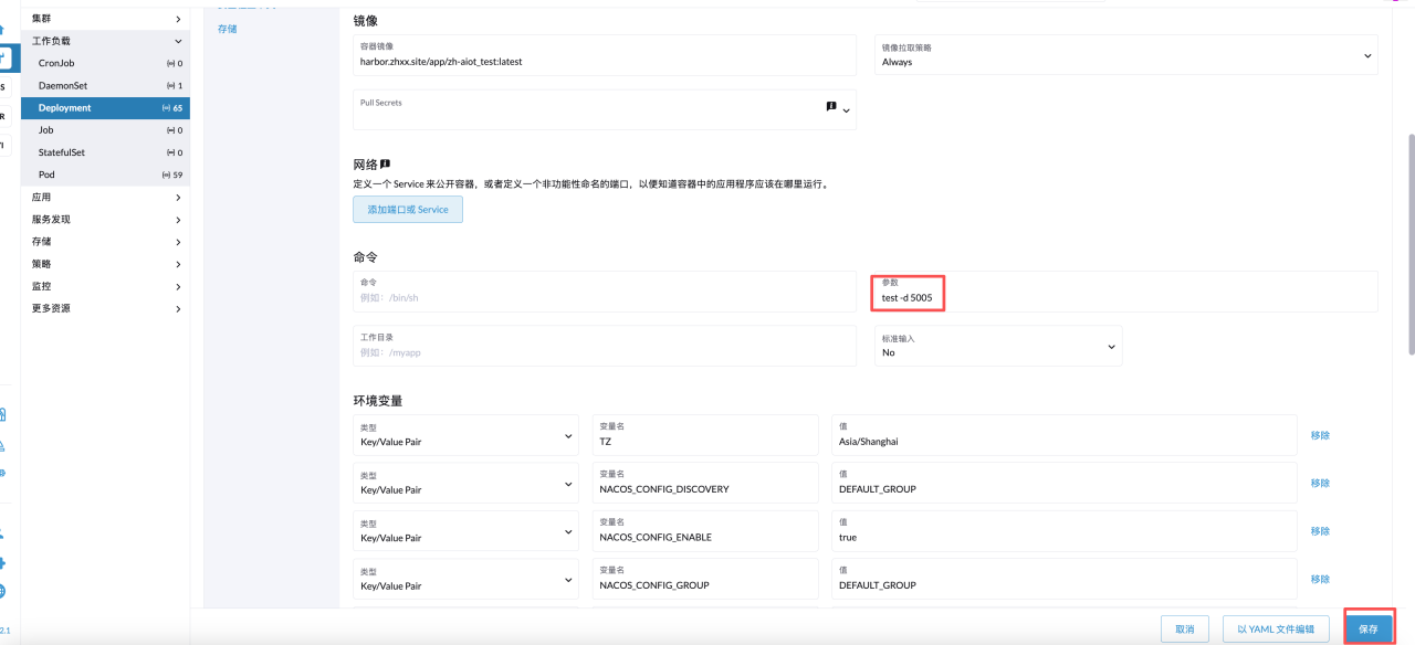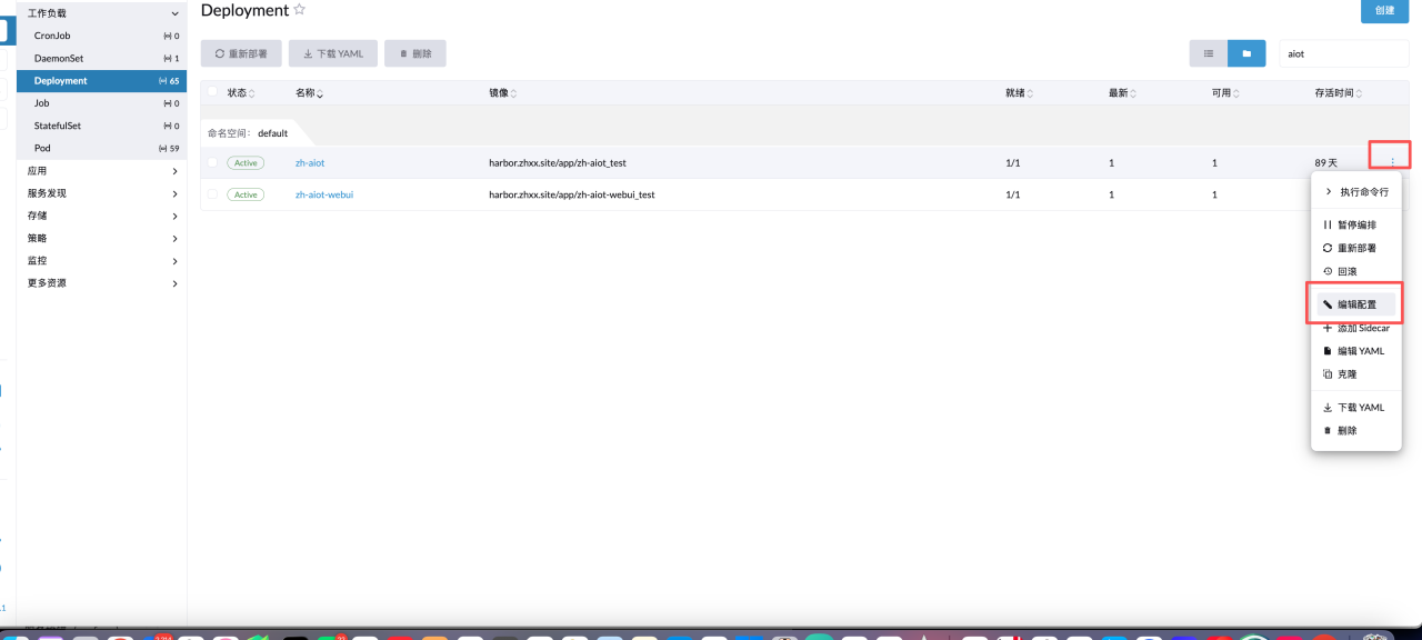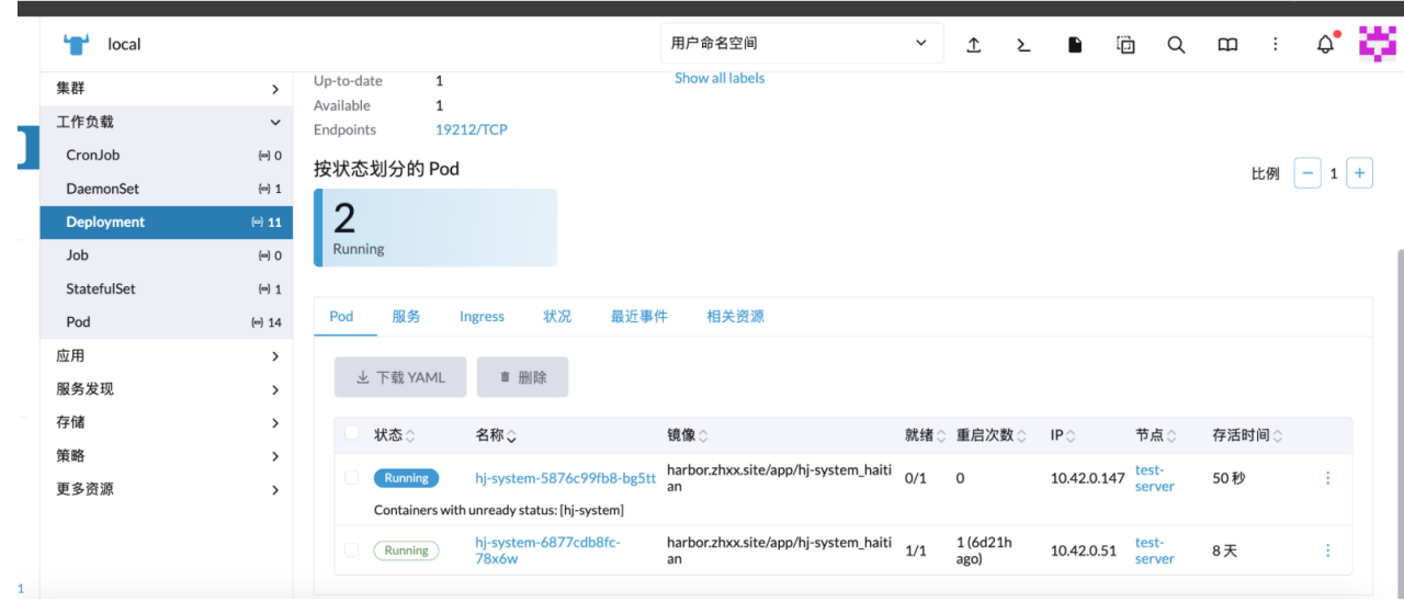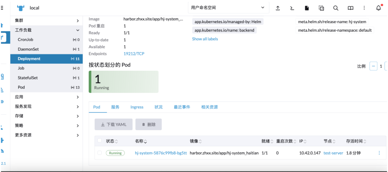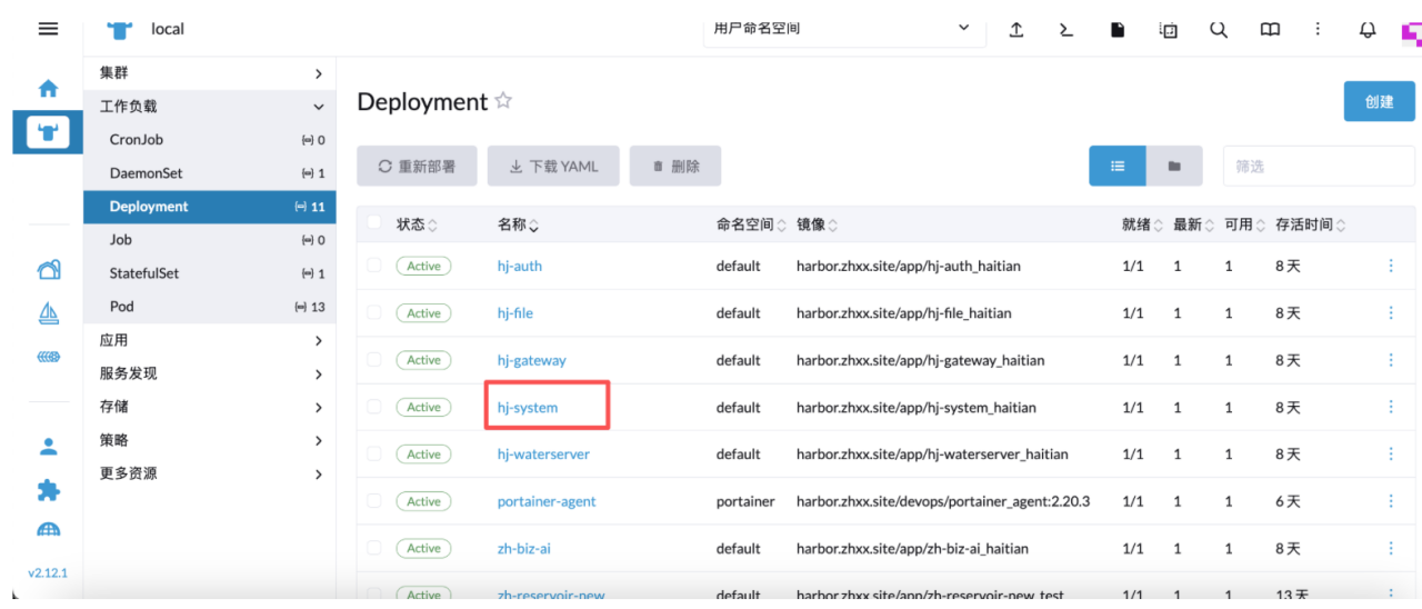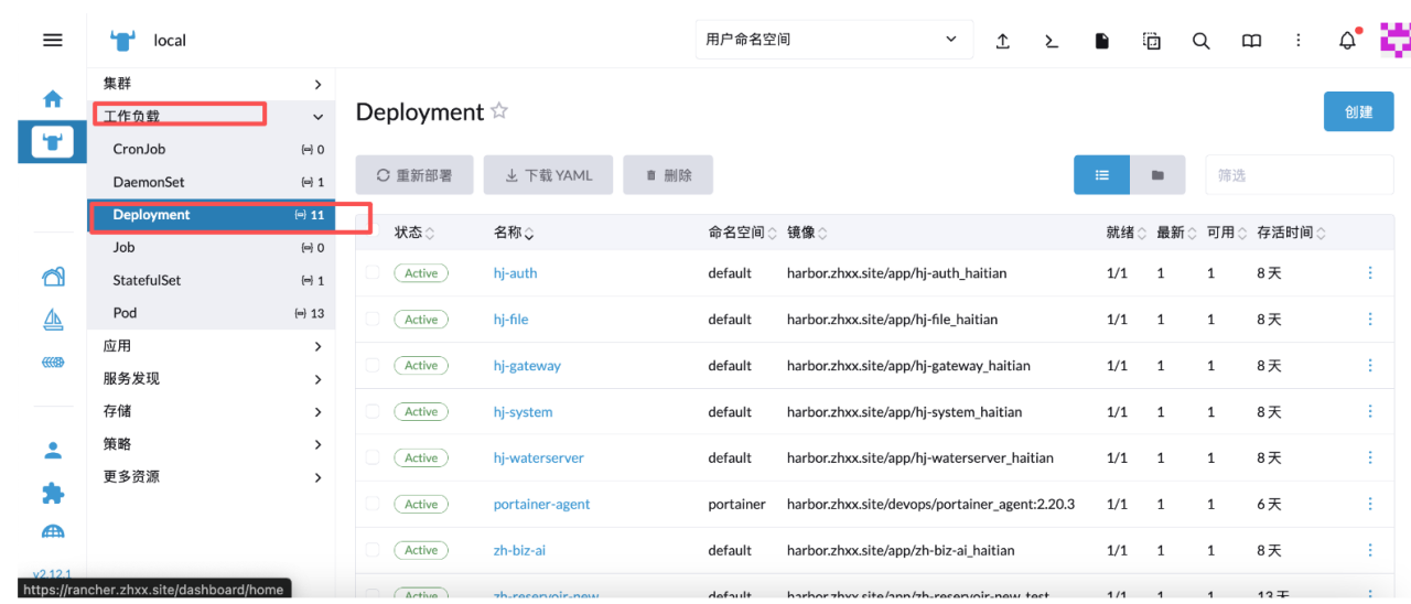 在工作负载的 deployment 下面可以看到所有部署的服务