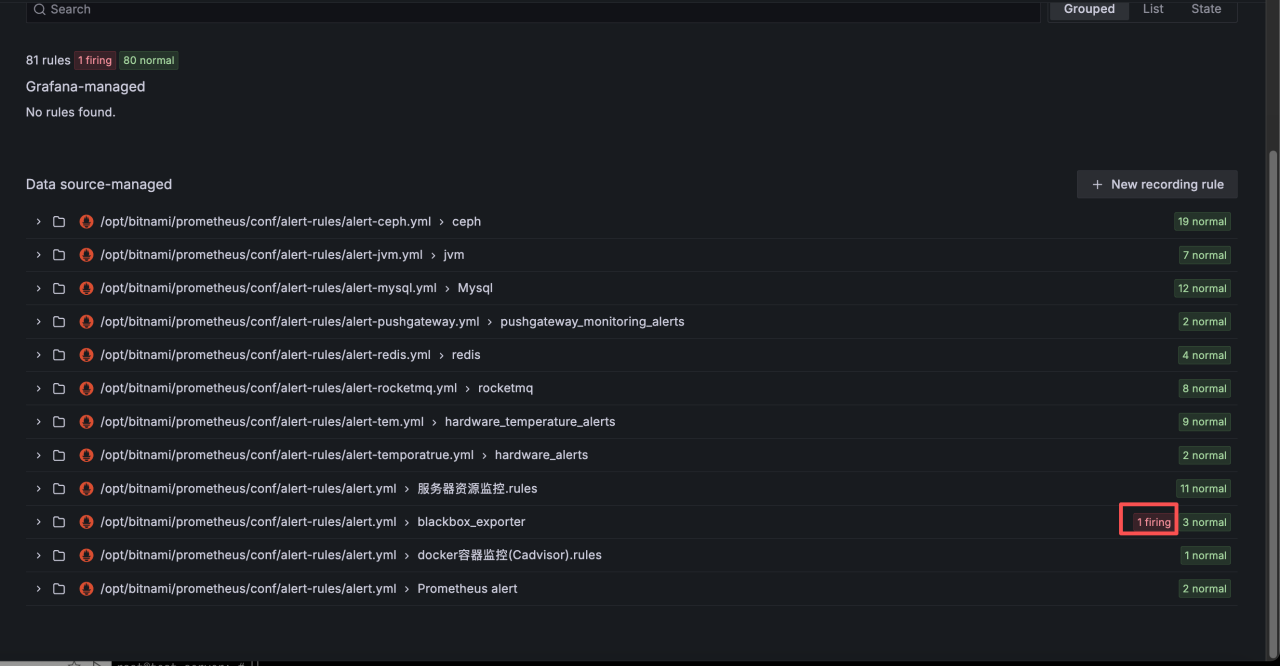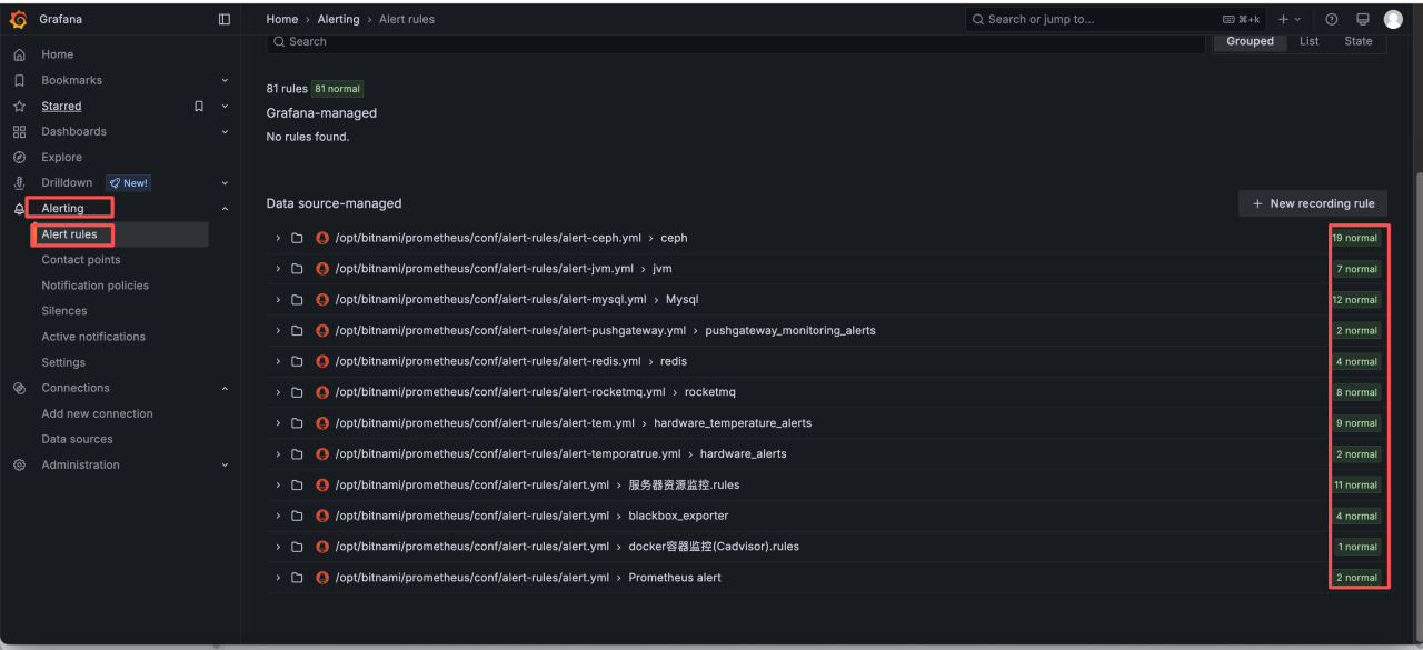 通过Alerting 下面的 Alert rules 可以查看到所有的监控告警,处于 normal 则表示正常状态。
