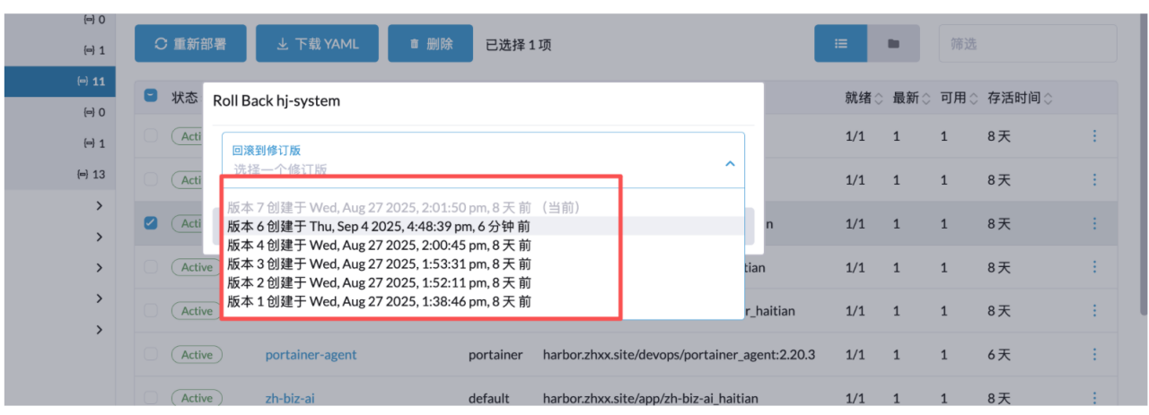 回滚需要选择版本,例如当前一共六个版本,版本 6 为当前版本,如需要回滚到上个版本,则选择版本 5.
