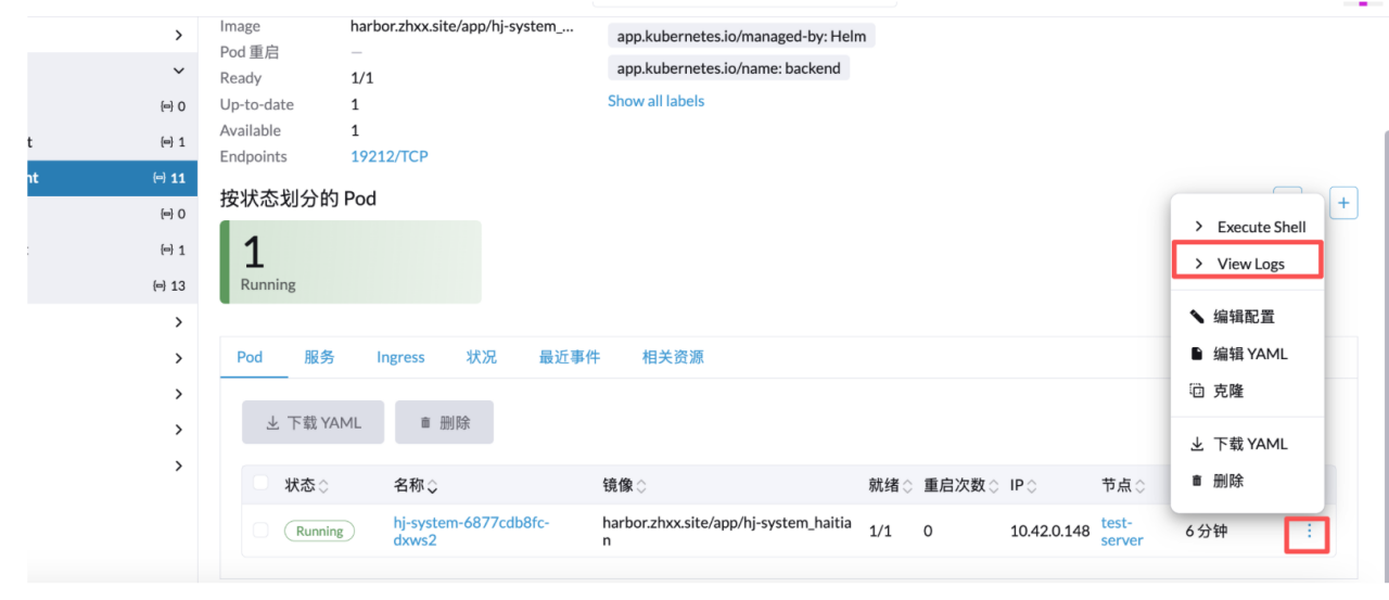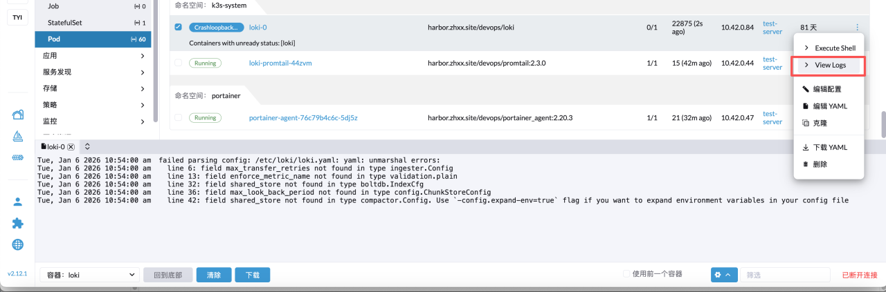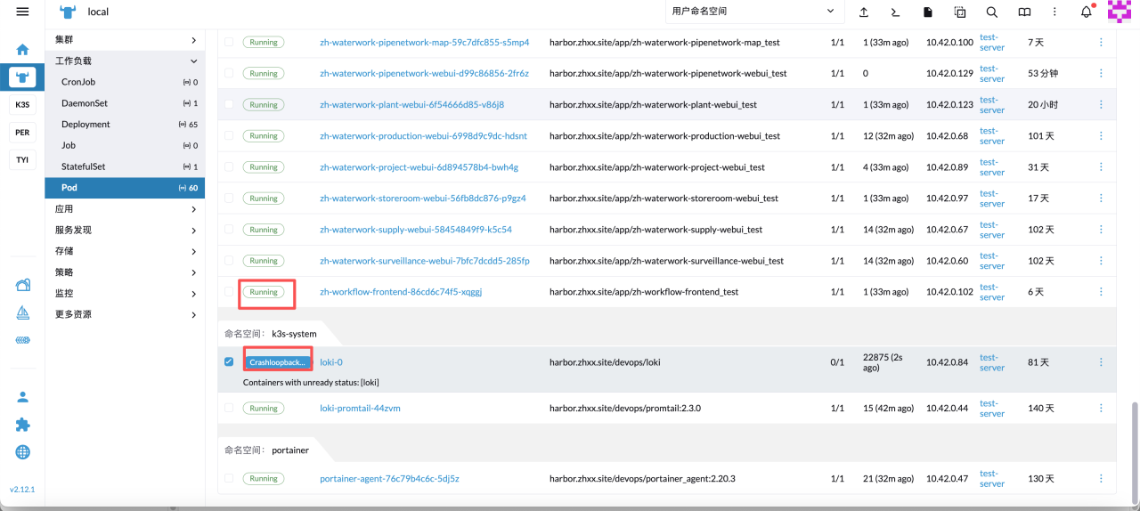这里排错和上面k3s 管理服务的排错一样,只是通过图形管理页面的方式对服务进行排错