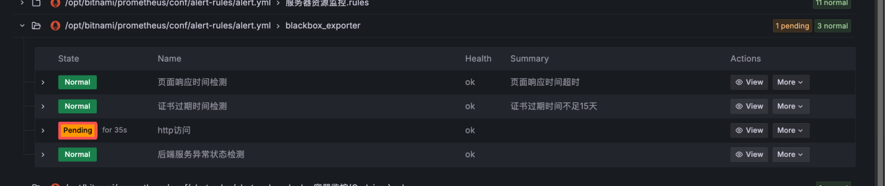 还有一种状态是 peeding,表示已经监测到异常,但未异常时间未达到设置的阈值。