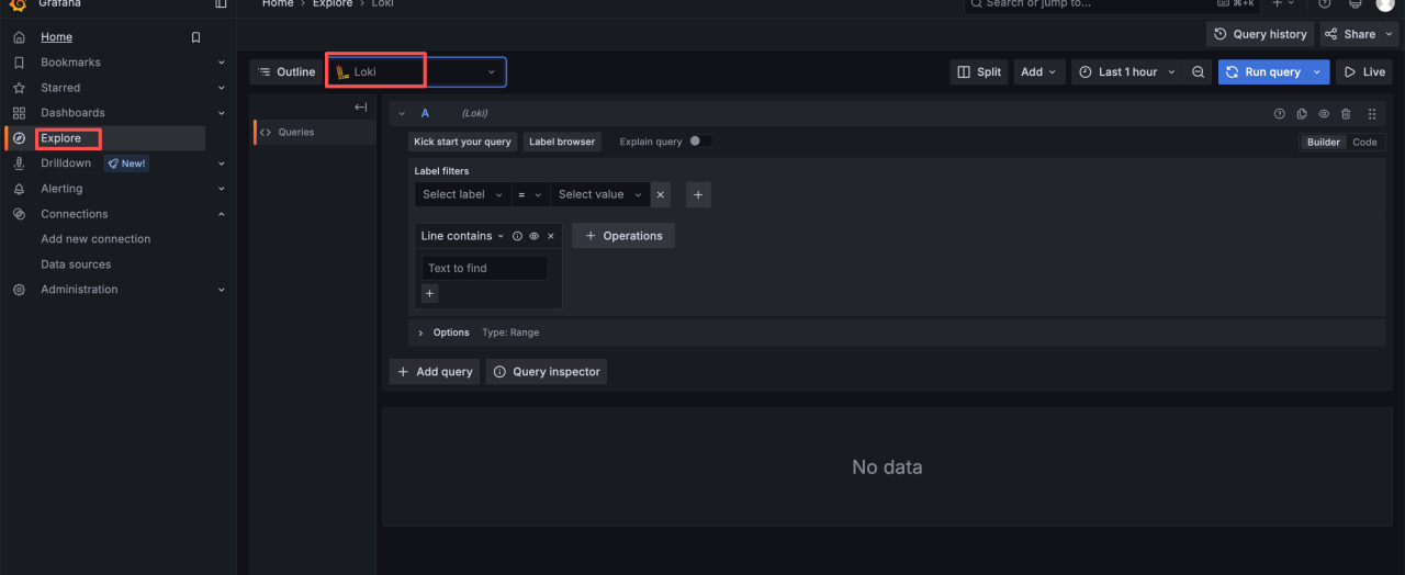 2.登录以后选择Explore 然后选择 Loki(这里默认是 Loki)